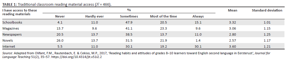 Out of a sample group of 466, an accumulative 83.5% (47.9% + 20.5% + 15.1%) of learners indicated that they sometimes to always had access to reading schoolbooks with the second highest average score of 3.32 and a standard deviation (SD) variation value of 1.01. Learners scored magazines as the third highest (3.06) materials to which they had access, with a SD value of 1.15, and 9.6% of the learners indicated that they always had access to magazines, as opposed to the 20.5% of learners who indicated that they never had access to newspapers. Similarly, 26.0% of learners reported that they never had access to novels. However, in a traditional classroom context, 30.1% indicated that they always had access to internet reading, which coincides with the 30.1% of learners who indicated that they sometimes had access to internet reading. In other words, even in a traditional classroom setting in which print materials are used, most learners also had access to internet reading materials, which produced a mean score of 3.60 (SD = 1.21), followed by access to schoolbooks with a mean score of 3.32 (SD = 1.15). The three lowest access value means were produced by magazines, newspapers, and novels, which produced averages scores of 3.06, 2.20 and 2.57.