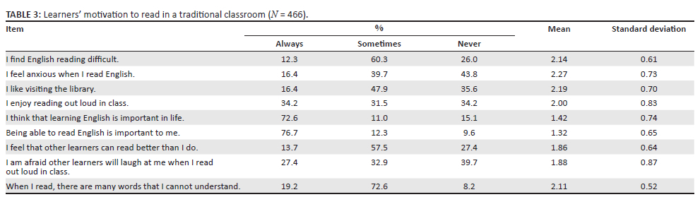 The questions in Table 3 sought to establish learners' motivation to read in a traditional classroom.