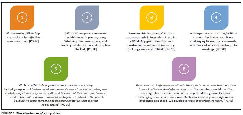 This forum for addressing 'difficult' things (Example 3, Figure 2) seemed to work particularly well because on the WhatsApp group, where they interacted daily, we all had an equal voice when it comes to decision making and contributing ideas. Everyone was allowed to voice out their ideas (…). Because we were correcting each other's mistakes, that showed social capital (Example 5, Figure 2). It is interesting to note that students can use core concepts from the course, such as 'social capital', when speaking about the interaction on the WhatsApp group, indicating a deep engagement with course concepts, and the ability to transfer these into other contexts.