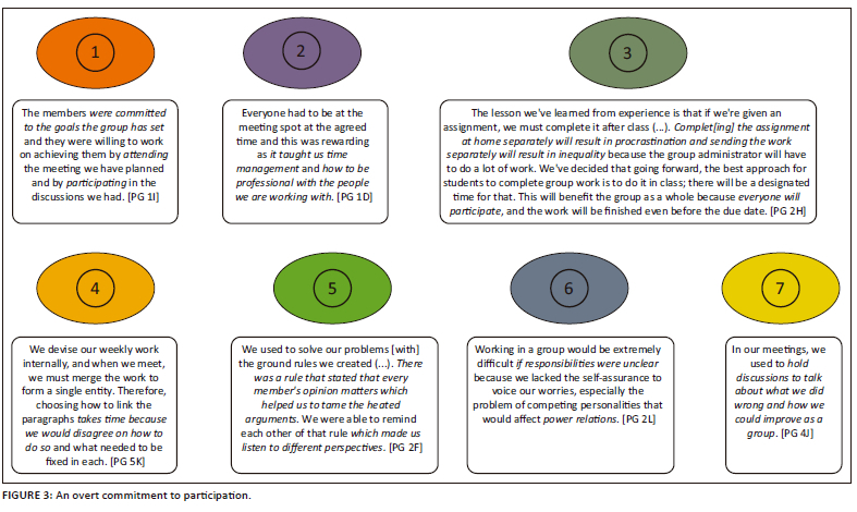 Another theme that strongly emerged was that some kind of overt commitment to participating in the group-learning process was necessary to facilitate effective dialogic engagement in groups; altogether 29 of the 44 groups brought this up. Example 1 in Figure 3, for instance, indicates how this could lead to an adherence to the goals of the group. This commitment often took the form of agreeing to meet in-person, as was the case with Examples 2 and 3 in Figure 3. The importance group members placed on meeting in-person highlights the social constructivist nature of learning (cf. Vygotsky 1962), and students' need for this within our context, as well as the need for an embodied presence to supplement other modes of communication, like the online group chats discussed above. Example 2 (Figure 3) indicates how the discourses, including behavioural conventions, of teachers in training started emerging through such a commitment, teaching the students how to manage their time, to be professional, and to treat colleagues with respect. By attaching value to such behaviour, students started investing in what Darvin and Norton (2018) refer to as their current and future identities, in this case as pre-service and future teachers. Example 3 (Figure 3) emphasises the importance of a commitment to equality in agreeing to be available in-person to work collaboratively in the same space and time - thus, what Brophy (2002) calls a well-developed class community which creates opportunities for democratic dialogue being established.