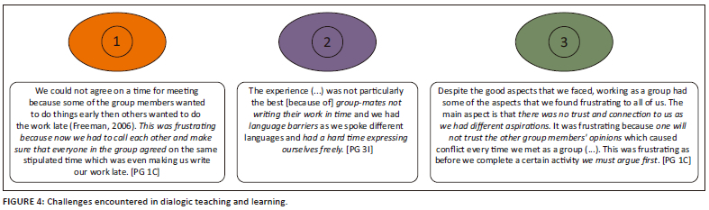 Students were not directly questioned about dialogic learning. However, upon reading their reports, I realised that dialogic learning emerged as a valuable learning mechanism in students' reflections. Therefore, I extrapolated from students' responses to make deductions about their experience of the dialogic teaching and learning occurring within groups. Accordingly, reports were analysed inductively to determine emerging themes related to dialogic learning unfolding from students' reflections.