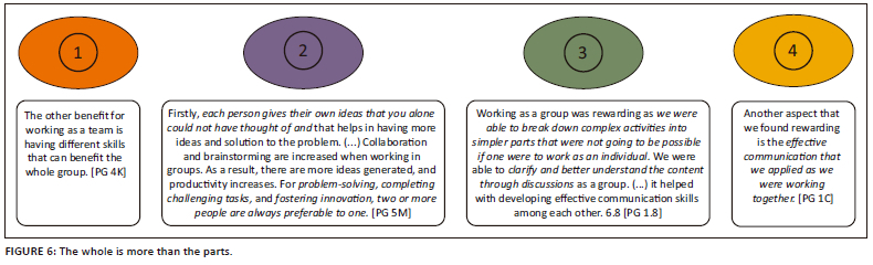 Although some groups experienced conflict they could not resolve, most groups (sometimes only eventually) experienced the action-learning project positively, as indicated by PG 5M: The aspects we found rewarding are collaboration, communication on WhatsApp, face-to-face meetings, and understanding our roles. In addition to these, major themes that emerged from the reflections were the affordances of drawing from multiple perspectives, the whole being larger than its parts, the development of multiple competencies, and the impact on students' future identities. These are discussed below.
