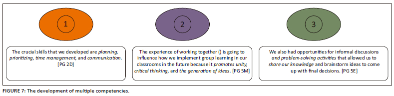 Twenty-five of the 44 groups explicitly mentioned various competencies they believed to have developed throughout the collaborative action-learning process. These include planning, prioritising, time management, communication, as well as the generation of ideas and critical thinking (Examples 1 and 2, Figure 7). The development of problem-solving as an outcome of dialogic interaction that happened during the action-learning project was also highlighted by groups such as the one in Example 3 (Figure 7). These self-reported gains in competencies, strongly linked to academic literacies, add to Lyle's (2008) findings that considerable evidence indicates that collaborative, dialogic talk contributes to cognitive development. Simultaneously, this provides evidence of students' metacognitive engagement with their developing competencies, and of their journey of critical examination, inquiry, and active engagement with knowledge through deep approaches to learning (cf. Biggs 1999).