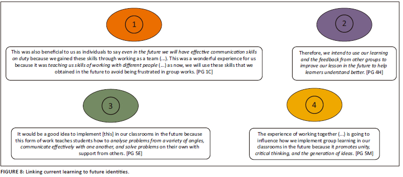 Strong evidence of students' investment in the course came apparent in terms of how they linked the dialogic teaching and learning that formed part of this action-learning pedagogy to their imagined future identities (cf. Darvin & Norton 2018), with 22 of the 44 groups commenting on this. These future identities manifested at two levels. Firstly, some groups pointed to a change in nearby future identities, in terms of their future selves as more senior students (as illustrated in Example 1 of Figure 8). Students reflecting on how they imagine their experience of dialogic teaching and learning influencing their future selves as teachers, emerges even more strongly, as illustrated in Examples 2, 3, and 4 in Figure 8.