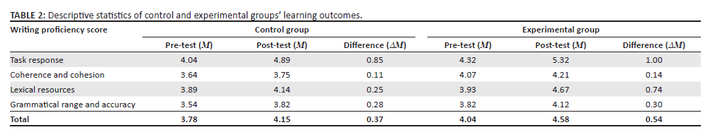 Conversely, the experimental group demonstrated significant improvement, starting from a pre-test mean score of M = 4.04 and reaching M = 4.58 in the post-test, yielding a considerable mean difference of 0.54. Detailed examination revealed substantial improvements in task response (ΔM = 0.68), coherence and cohesion (ΔM = 0.14), lexical resources (ΔM = 0.74), and notable improvement in grammatical range and accuracy (ΔM = 0.30).