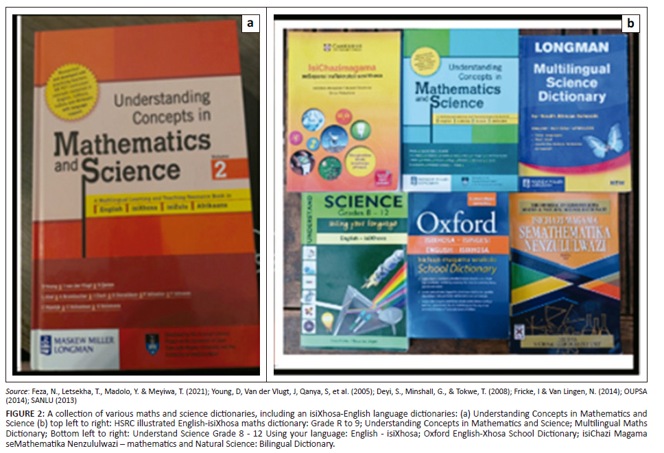 Both researchers work at the same university in teacher education in applied language and literacy studies. Guzula has isiXhosa and English competencies like those of Mrs L and the learners, among other language resources in her linguistic repertoire, while Abdulatief has English-Afrikaans linguistic competencies in her linguistic repertoire. They were part of the L4L team that provided workshops and input on teachers' materials development activities, discussions and reflections on their teaching, language practices and language ideologies as well as coaching and mentoring in multilingual pedagogies in the classroom between 2022 and 2023. Initially, the researchers visited the school fortnightly, alternating between two schools, and later once a week during this 18-month period when teachers in the other school dropped out and observed Mrs L and learners during school hours. The researchers provided Mrs L with additional multilingual mathematics dictionaries (Figure 4) so that she could translate mathematical terms into isiXhosa for the class. Sometimes the researchers became participant observers and engaged in discussions about the definitions derived from the dictionaries and helped both the teacher and the learners in choosing the most meaningful definitions of concepts from the variety of dictionaries provided. The researchers also engaged in reflective conversations with the teacher and sometimes with the learners after the lessons.