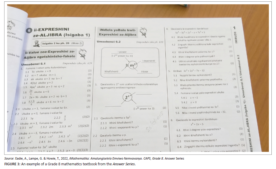 As part of teacher support, the L4L project provided the mathematics teachers with a textbook written in isiXhosa iMathematika: Amalungiselelo emviwo nemvavanyo, Greyidi 8 by Anne Eadie, Gretel Lampe and Tracy Howie in 2022. The provision of this textbook in one of the L4L workshops was important as it made the following aspects possible: firstly, it provided access to mathematical terms and knowledge in isiXhosa. Secondly, although textbooks and other resources for content knowledge in African languages are slowly being introduced into the market, currently 95% of school textbooks for Grades 4-12 are in English. Providing Mrs L with a free copy of the textbook was important because purchasing this textbook would be beyond the means for learners and many teachers who need them and the books are difficult to find.