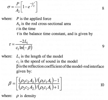 Sanderson and Simmons17 approximated their test model as a cylinder. They analysed the wave transmissions for a step force input to determine the stress in the rod just behind the model where the strain gauges would be positioned.