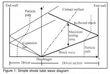 A simple shock tube consists of two ducts initially at different pressures and separated by a frangible diaphragm as shown in the time-distance plot of figure 1.