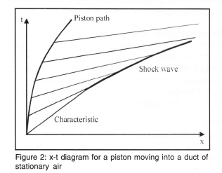 The most useful tool for representing such flows is known as the x -t, or wave diagram. The mathematical technique used to construct them is known as the method of characteristics (Thompson14). The underlying principle is that any flow perturbation will travel at the speed of sound in the flow. When the frame of reference is fixed relative to the wall of the duct then the perturbation will travel at the local speed of sound plus the local gas velocity. The flow resulting from an opening valve can be represented as a piston starting from rest and accelerating down a tube driving gas ahead of it as shown in figure 2.