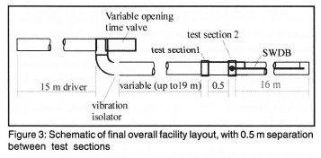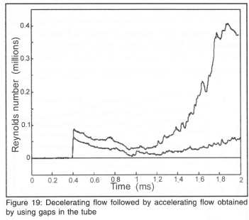 Bursting of the diaphragm causes a shock wave to move down the low pressure section and an expansion wave up the other. This will form the basis of the current facility. However, in order to develop a compression wave rather than a shock, rapid removal of a diaphragm is unsuitable and needs to be replaced by a valve whose opening time can be controlled so as to generate waves of different rise times and thus different flow acceleration around the body.