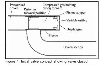 Figure 4 is a schematic of the initial valve arrangement. The driver and driven sections of the shock tube are separated by a piston which is held in place by compressed air, which in turn is confined by a frangible diaphragm. To open the valve the diaphragm is burst thereby venting the air. A variable orifice is incorporated to modify the venting time and thus the pressure difference across the piston and thereby the valve opening time. A T configuration between the driver and driven section is used to ensure easy diaphragm replacement and maintenance access.