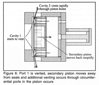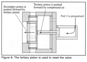 Cavity 1 is that which controls the main piston motion which vents the driver as shown in figure 4. The second piston is initially held forward by pressurising cavity 2. This cavity is decompressed, relatively slowly, through port 1, through a small ball valve. This reduces the pressure holding the secondary piston so it starts to move backward. Once the sealing o-rings disengage, the air holding the secondary piston vents rapidly and the piston moves back very quickly, dropping the pressure in cavity 1 and allowing the tube to fire. Thereafter the tertiary piston is forced forward to reposition the secondary piston by supplying air to port 3. The tertiary piston is then withdrawn by venting port 3 and pressurising ports 1 and 2 in readiness for the next firing. This design resulted in quiet operation. In order to control the outflow so as to adjust the wave rise time the original internal variable orifice was replaced by a movable steel ring which could be adjusted over the outlet ports. The final assembly showing the outlet ports and adjacent adjustment ring is given in figure 9 with the tertiary piston and supply lines on the right.