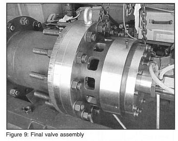 In order to overcome issues relating to changing of diaphragms and irregular bursting, the initial venting of the chamber was accomplished by adding a novel design incorporating two additional pistons. The assembly shown in figure 5 is attached to the end flange which originally clamped the diaphragm.