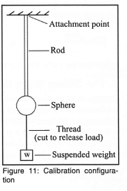 The ideal way to perform the calibration would be to apply a known impulse and record the balance response. The response would then be normalised to obtain the unit impulse response. The problem is to be able to apply a known impulse. However, the derivative of a step input is an impulse. For this to work the step input force application has to be instantaneous compared to the response time of the balance. Secondly the response has to be differentiated which amplifies any noise in the signal. It is practically impossible to apply a step input through an impact hammer or similar device, so the technique which has been evolved is to remove a force in a step-like manner. This is done by suspending the balance vertically from a thin thread attached to the model, and then the thread is cut as rapidly as possible. As long as the thread releases the load far faster than the mechanical response time of the balance, then the calibration is valid.