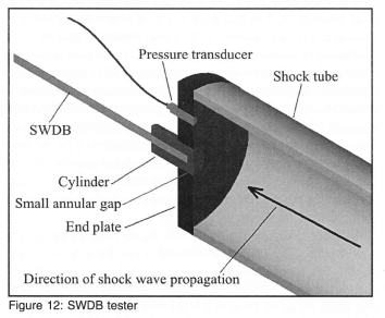 The second challenge is ensuring that the testing time is adequate. When the stress wave propagates to the end of the balance it reflects and returns to the front end of the balance where it reflects again. It can oscillate a number of times before decaying. Every time it passes the strain gauges it causes a response. As long as the impulse response included this response, the reflections can be deconvoluted out of the signal. For the current shock tube application it was found necessary to constrain the end of the balance in the shock tube. This resulted in vibrations from the valve closure entering the rod from the rear, although as described later, methods to overcome this problem have also been implemented. What is crucial, however, is to ensure that the boundary conditions during calibration are identical to that during operation, even if this means reducing the testing time. This is not a serious limitation for the present case where the phenomenon of shock diffraction, i.e. shock propagation over the body, is of very limited duration.