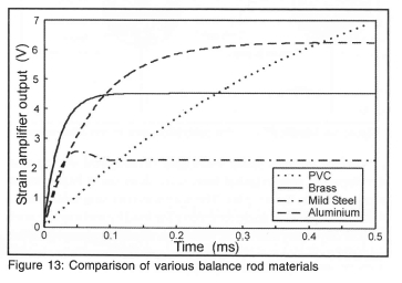 These changes allowed the choice of rod material to be revisited to produce a stiffer balance. The mechanical response time would be reduced and the signal to noise ratio increased when compared to the PVC balance with conventional gauges. Mild steel, aluminium, brass and PVC were compared. A rod diameter of 8 mm was retained for all cases as was the cylindrical model used previously, as well as the signal amplification arrangements. The comparison is based on the theory given by Sanderson and Simmons17, for the first 0.5 ms of operation, since this is the main region of interest. The results are given in figure 13. The fast mechanical response time of the brass would result in less noise from deconvolution and was thus chosen for the final balance. A 3 m length of 8 mm diameter brass rod was obtained and instrumented with semi-conductor gauges.
