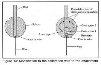 An additional step was to reduce the transmission of vibrations from the wire into the balance. Figure 14 shows the original arrangement and the modifications made. In the original set-up the wire is in direct contact with the rod allowing direct transmission of wire vibrations. The approach was then to pass the vibrations into the model itself which would attenuate these perturbations. A short grub screw was inserted into the model and tightened up against the knot in the wire. A second grub screw was inserted with a small air gap between it and the first screw and the rod was then tightened such that it locked against this screw. This resulted in the stress travelling through the body of the model. In addition a 5 mm thick neoprene disk was inserted between the wire knot and the first grub screw. These actions reduced the vibrations to an acceptable level, and since there was no overshoot a filter could be used that would remove the remaining vibrations without affecting the significant features of the impulse response.