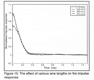 Various support wires were also investigated during this development phase. Initial tests were done using high tensile wire to support the weights. The wire was cut using side cutters. Attempts were also made to remove the load by melting the wire with an oxy-acetylene torch. Although the melting was rapid the material still yielded over a long length of time relative to the mechanical response time. In another set of tests the wire was replaced by string, which was either burned or cut. However the individual fibres did not fail simultaneously thus causing large spikes in the applied load. Initial tests with nylon gut looked very promising as the vibrations were significantly reduced as long as a suitable length was chosen. If it was shorter than 600 mm the vibrations remained, and if it was longer than 1 200 mm the step response appeared to be damped. However the main problem was that the rise time of the force was too slow and the requirements of the deconvolution could not be met. The gut tests highlighted the influence of length and further tests were then done for the high-tensile wire. It was found that the response was independent of length for lengths of 35, 56, and 87 cm but was affected for very short lengths as shown in figure 15. The results for the 56 and 87 cm lengths are almost indistinguishable. It is suspected that for very short lengths of wire the stress ramp induced in the wire at cutting cannot steepen up into a step input. Tests were also done to find if there was an influence of test weight. Ideally the wire should be loaded very close to its failure load in order to get very rapid separation. However, various loads have to be used in order to determine the linearity of the balance. It was found that a 30% variation in applied weight has no effect on the rate of loading and hence the impulse response. Within these constraints and with the modifications made, the calibration and deconvolution procedures met all the requirements for shock tube implementation and testing.