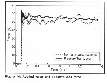 The initial unfiltered results indicated that the hollow sphere was oscillating. This was then replaced with a solid sphere but this has the effect of increasing the mechanical response time of the balance. It was thus clear that the signal to noise ratio had to be improved as well as reducing the response time. One option was to improve the strain gauging. The conventional gauges were thus replaced with semi-conductor gauges with gauge factors of 150, giving a signal to noise ratio improvement of 75 times. Another issue to consider is gauge length. It is clear that gauge length should be kept short in the direction of stress wave propagation in view of its variation in time. In the present application gauge lengths of 1 mm were chosen. A second method of increasing the output is to increase the bridge voltage. In order to limit the current, higher resistance gauges should be used. 350 Ωgauges were selected. The effect of these changes was to improve the signal to noise ratio by a factor of 219.