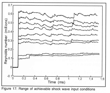 Because of the finite opening time of the valve a compression wave is produced just downstream of it as indicated in figure 2. This steepens up as it propagates down the tube. For pressure measurements taken at 3, 5, 7, and 9 m from the valve the initial section of the pressure wave contained a shock which grew stronger as the wave propagated down the tube. By the time it reached the test section at 14.2 m from the valve it had completely formed into a shock. The range of shock wave flows achieved is shown in figure 17. Although the post-shock flow is a bit noisy, presumably due to the very complex flow at the valve, it is reasonably uniform and acceptable for testing. Reynolds numbers from 100 000 to 600 000 can be obtained. These results were obtained with the valve opening as rapidly as possible, with the variable orifice fully open, and with the variation in Reynolds number achieved by simply varying the driver pressure.