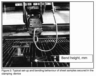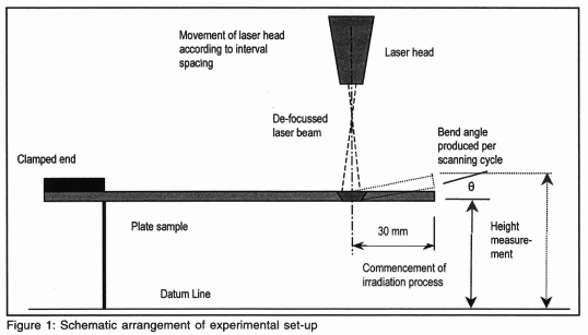 Irradiation of the sheet surface commenced 30 mm from the free end and over a minimum length of 100 mm. This minimum length depended upon the beam diameter and interval spacing employed for the particular process settings indicated above. Upon securing the clamping device in position, the sample was coated with a graphite spray to allow for maximum absorptivity of the sample surface i.e. to reduce the reflectivity of the laser beam. As this was a first order investigation height measurements were taken at the free end of the sample using a vernier-caliper after every scanning cycle. Measurement time took on average approximately 35 seconds. This measuring time must be noted because the sample would have additional time to cool between consecutive scanning cycles that would result in a slight change in bend curvature.