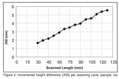 Hence, when the scanned length (SL) tends to zero, the bend height resolves to approximately the datum height of the sheet sample prior to 'line heating' process. It should be noted that the scanned length refers to the horizontal distance over which the sample was irradiated (considering the interval spacing and number of positions scanned). Similar expressions were obtained for the subsequent bend samples given in table 1, which also provide the scanning parameters employed. The incremental difference in bend height (IHD) per scanning cycle was observed as having a linear trend, see figure 4, over the scanned length (SL).