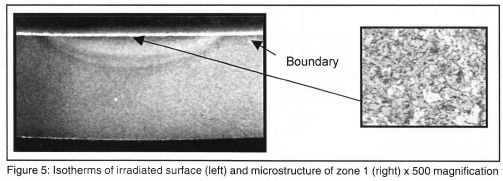 From equation 2 when scanned length tends to zero the IHD is 0.4363 mm. This discrepancy indicates a percentage error of 1.5% and that with improved measuring instrumentation would result in the IHD be equal to zero. A slight twisting was observed along the edge where the beam exits the sheet sample and assessed at approximately 3% of the sheet width in the worst condition. Scully1 identified this occurrence as a result of the high heat intensity experienced by the plate along the exiting edge. However, this twisting effect was subsequently nullified by allowing the beam to exit the sheet sample at opposite edges during subsequent irradiation positions. Although unable to assess the surface temperatures, an indication of the temperature range reached was possible by conducting microstructural evaluation (considering the 1.5 kW laser parameters). Here the microstructural changes in the centre of the irradiation path (zone 1 - figure 5) indicates a martensitic/ferritic structure implying that the temperature experienced within this zone was above the A3 temperature i.e. in the ferrite/austenite phase field.
