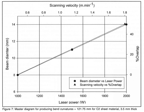 In characterising the above laser and scanning settings, a master diagram as shown in figure 7 was developed. This diagram allow for predetermining the laser and scanning parameters for producing bend curvatures of approximately 122 mm for this C2 material within the limits as indicated in figure 7.