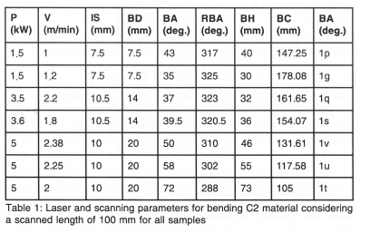 Initially a number of samples were bent to different radii of curvature in attempting to achieve the bend curvature required. These bend curvatures were in the first instance graphically assessed and later verified using a Taylor-Hobson instrument. It should be noted that the bend angle and bend height values as indicated in table 1 are with respect to a scanned length of 100 mm. This was done to provide a base length for all bend samples. The results giving the scanning and laser parameters as well as the bending behaviour of the sheet samples are also given in table 1.