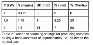The laser and scanning parameters to produce a curvature of approximately 120 mm is given in table 2.