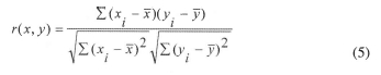 Correlation coefficient, a normalized measure of the strength of the linear relationship between two variables, is used in this study to investigate the dependency of a sensor signal on a process parameter12. The correlation coefficient r(x, y) of variable y to variable x is calculated as: