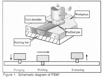 Friction Stir Welding (FSW) is a joining technique developed by TWI in 19912. During the FSW process, a non-consumable cylindrical wear resistant tool consisting of a profiled pin under a wider shoulder rotates on its own axis and moves along a joint between two plates to produce a high quality weld. Material in the joint is plasticized due to frictional heating between the tool and the workpieces. The welding tool moves along the weld joint stirring the plasticized material across the material boundary, forming a cold-forged bond. The tool is extracted from the workpieces when required weld length is finished. The process schematic of FSW is illustrated in figure 1.