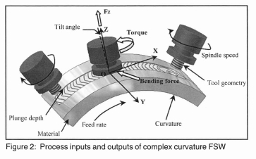 During complex curvature FSW, the relative motion between tool and workpiece causes sufficient forces and torque for cutting, stirring and pressing the material to generate material flow and friction heat. Inputs of FSW include process parameters (feed rate, spindle speed, plunge depth and tilt angle), and process conditions (tool geometry, parent material and thickness). Outputs generated from the FSW process include: downward force Fz (vertical force required to plunge the tool pin into the workpiece and maintain shoulder contact with the surface of the workpiece); torque (spindle torque required to rotate the FSW tool when plunging into and traversing through the workpiece along the joint); tool temperature (the temperature at the tip of the tool pin); bending force (the maximum resultant force vector or bending force, measured by means of strain-gauge elements, which rotate with the tool holder as it senses the strain or bending moment on the tool holder shaft due to the applied load on the tool tip in the x-y plane), etcetera. Figure 2 shows the process parameters, process conditions, process outputs and the co-ordinate system of complex curvature of FSW.