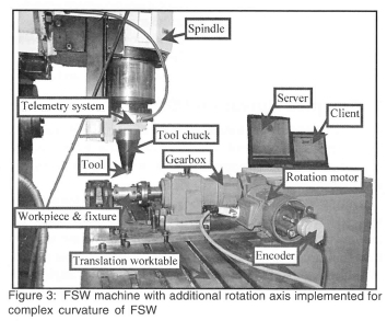 A telemetry system instrumented on the tool chuck was built to obtain on-line detailed information about process variables. The sufficiently high sample rate of process variables from the telemetry system and encoders allows acceptable response time for on-line monitoring of complex curvature FSW.