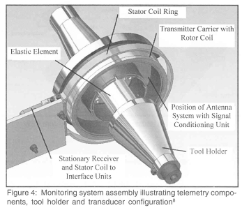 The electronics mounted on the chuck were used to sample the required process variables. Raw sensor data was signal-conditioned and then passed to a microprocessor - where it was prepared for transmission to the TS 1000 interface. Electrical power is transferred to the chuck, using induction, and the sampled data is sent off the chuck in digital form using a capacitate technique. Strain gauges and thermal couple were fitted on the chuck and tool to detect horizontal forces, vertical force, torque exerted on the tool, and the tool's pin temperature. When the interface unit receives a request for data, it transfers the information via the RS232 serial interface to the computer. Figure 4 illustrates the telemetry monitoring system assembly8,9.