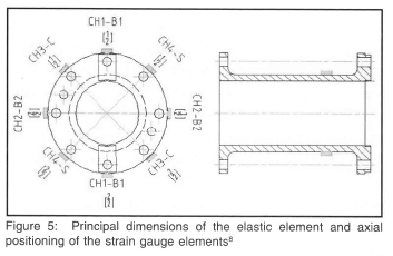 Specifically arranged precision foil-type strain gauges were attached to a thin shell cylindrical element to measure forces and moment acting on the tool assembly. The strain gauges were applied on the outer surface of the elastic element and on a common centre line in full bridge configurations to compensate for unwanted superimposed stresses. Figure 5 illustrates the axial positioning and channel number of the strain gauge elements. The two bending channels channel 1 and 2 measure bending in the x & y direction. Channel 3 measures the compression or tensile force in the axial direction while channel 4 measures the shear load8.