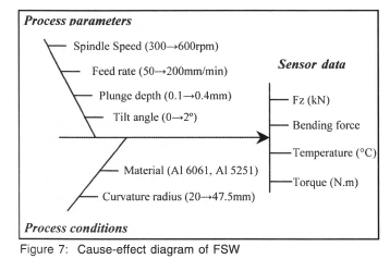 Experiments on aluminium flat plates and round tubes were conducted to acquire sensor data with the telemetry system. Different process conditions and various process parameters were used in the experiments to record on-line sensor data of bending force, torque, vertical force (Fz) and temperature. Figure 7 shows the welding cause-effect diagram.