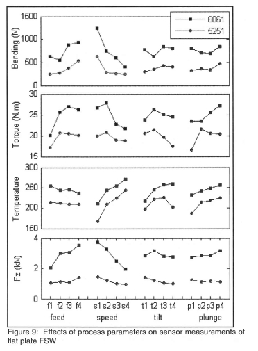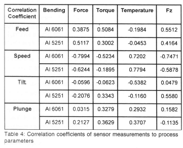 Table 4 shows the correlation coefficients of sensor measurements to process parameters of Al 6061 and Al 5251 flat plate welds. It shows that all sensor measurements have high correlation to feed and speed; while torque and temperature show higher correlation to plunge and tilt than the other two sensor measurements.