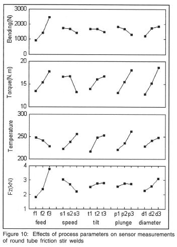 It can be seen from table 2 and table 3 that temperature is the most sensitive signal to spindle speed, tilt angle, and plunge depth. Fz has a higher sensitivity to feed and speed than plunge and tilt. Torque is more sensitive to plunge depth and tilt angle than the other sensor signals. Both the flat plate and round tube experimental data illustrate that the error contributions associated with sensor signals are acceptable (less than 8%). This implies that the most important process conditions and parameters that influence these characteristics were included in the experiment11.