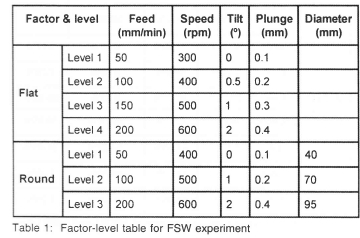 Orthogonal arrays (OAs) developed by Taguchi were used in experiment design due to their capabilities of minimizing test number and representing all factors equally10. L16_4_5 and L18_3_7. OA experiments were chosen for FSW of flat plates (Al 5251 and Al 6061) and round tubes (Al 6061) respectively. The Al 5251 round rube welding was not carried out as this type of tube was not available. The factor-level table for flat plate and round tube FSW is shown in table 1.