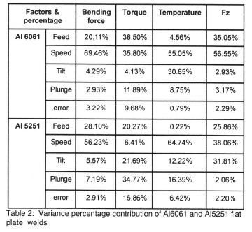 Using analysis of variance (ANOVA) of the OA experiment, the percentage contribution of each factor to each state variable variance was calculated. Table 2 shows the percentage contribution of each process parameter (feed, speed, tilt and plunge) on sensor measurements of data collected from the OA experiments of Al 6061 and Al 5251 plate welds.
