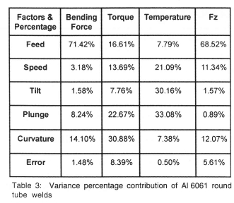Table 3 shows the percentage contribution of process parameters (feed, speed, tilt and plunge) and process condition (curvature) on sensor measurements from the data of Al 6061 round tube welds.