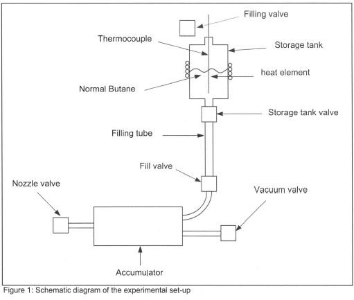 In designing the experimental set-up it was decided to make use of an accumulator into which a metered amount of liquid butane could be fed. In the accumulator the butane could then be heated and then exhausted through the nozzle by opening the nozzle valve as shown in figures 1 and 2. The set-up also needed to be able to be placed inside a vacuum chamber, a schematic diagram of the accumulator, in more detail, is shown in figure 3.