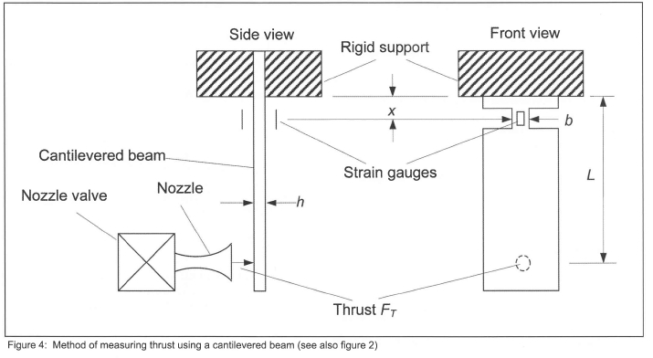 Figure 4 shows the cantilever beam clamped in a rigid support that could be adjusted in front of the nozzle such that the free end of the beam could be aligned with the nozzle. When the thruster is firing, the cantilever beam deflects and a strain is induced due to the bending moment caused by the propellant exiting the nozzle and impacting against the free end of the beam. The maximum strain is induced at the supporting end of the beam. The strain gauges were mounted as close as possible (but not so close such that edge effects dominate and simple beam theory cannot be used) to the supporting end of the beam in order to measure as high a strain as possible for a sufficiently rigid cantilever with a natural frequency significantly higher than that of the thrust force.