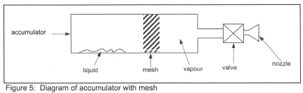 The two-phase model of the liquid-vapour butane was able to capture the behaviour of the flow and heat transfer in the accumulator reasonably well. The two-phase model was able to accurately predict the pressure in the accumulator in comparison to the pressure measured experimentally. The behaviour of the butane with mesh discs in the accumulator was also simulated with reasonable success. This model has however certain limitations. One of the assumptions made was to model the vapour as a single control volume. With the mesh in the accumulator this single control volume for the vapour proved to over predict the pressure recovery in the accumulator after the nozzle valve was closed. In order to be able to model the pressure recovery in the accumulator more accurately a more complicated model than the relatively simple model proposed by Joubert16 is required. A more complicated model could be to model the vapour as three control volumes: two vapour control volumes on either side of the mesh, and one control volume for the vapour in contact with the mesh.