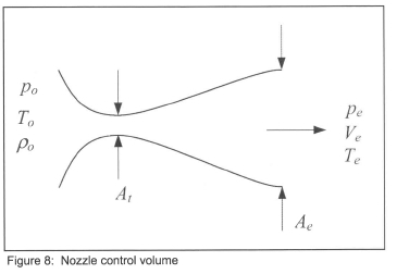 To calculate the thrust the following exit properties of the flow at the exit plane of the nozzle need to be known: ṁe, Ve and pe.These properties were calculated using traditional gas dynamic theory10,12. Simplified gas dynamics assumes a reservoir of gas at constant pressure and temperature. In modelling of the system this is not the case as the pressure inside the reservoir starts to drop as soon as the valve is opened. However the assumption was made that the velocity of the fluid at the entrance of the nozzle is low enough to assume that the pressure and temperature is equal to the stagnation pressure and temperature of the reservoir or accumulator. The flow of the fluid through the nozzle was modelled as a single control volume. The stagnation properties of the fluid inside the accumulator were taken as the initial conditions for each new time step. Figure 8 shows the control volume for the nozzle.