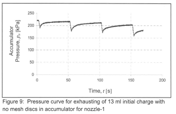 In this section the results obtained from the theoretical model will be given and compared with the experimental results for different number-of-mesh discs in the accumulator. The nozzle valve is opened for a 5 s burst before it is closed again. After the valve is closed the pressure recovery of the butane in the accumulator is observed.
