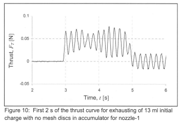 Figure 9 shows the pressure readings for both pressure transducers with a 13 ml initial charge of butane in the accumulator using nozzle-1 (this corresponded to more-or-less the total volume of the filling tube). It can be seen that both pressure readings coincide with each other. The nozzle valve was opened for 2 s, closed for 50 s and then opened for 2 s again. This was repeated until all the butane was exhausted. The pressure curve for only the first four bursts are shown. Figure 10 shows the thrust curve for the first 2 s burst. Figures 9 and 10 are from an experiment conducted with no mesh in the accumulator.
