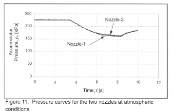 The nozzle (nozzle-1) that was used in the tests conducted to test the influence of the amount of mesh in the accumulator had Shockwaves in the nozzle. A second nozzle was designed that would allow for supersonic flow to exist throughout the nozzle. Although Shockwaves did form in this nozzle (nozzle-2), as the pressure continually decreased in the accumulator, there were no Shockwaves present at the start of the tests. Figures 11 and 12 show the pressure and thrust curves for the two different nozzles. In these tests that were conducted there were no mesh put in the accumulator. To compare the two nozzles the nozzle valve was opened for 5 s before closing it again. The valve was only opened and closed once.